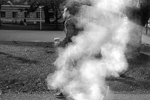 - Frame 10, “Bubble Gum Selfie” is a photo that never should have been. If you wonder how anyone can achieve such horrible fidelity in the presence of so much light, the answer is “run a test in which you use a known speed-enhancing developer (say, Caffenol-C-L) to develop a roll of Tri-X, which you exposed at box speed.” Actually, you don’t have to run such a test. I did. It ain’t pretty. Not that it matters, but the camera was a Leica M2 and the lens was a Voigtlander 50mm f/1.5 Nokton.